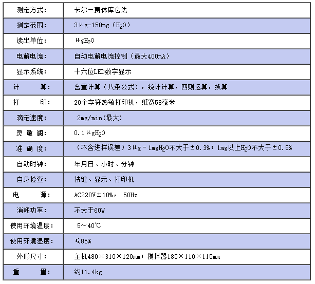 儀器符合GB/T7600;SH/T0246;GB/T606及采用卡爾—費(fèi)休法測(cè)定樣品中水分的有關(guān)標(biāo)準(zhǔn)。 儀器采用了先進(jìn)的自動(dòng)控制電路,電解電流自動(dòng)跟蹤控制,外型結(jié)構(gòu)新穎,從而使該儀器工作更可靠,使用更方便,具有分析速度快(一分鐘出結(jié)果)、操作簡(jiǎn)便、精度高、自動(dòng)性強(qiáng)等特點(diǎn),同時(shí)具有自動(dòng)打印功能,可將實(shí)驗(yàn)結(jié)果、做樣時(shí)間、樣品編號(hào)自動(dòng)打印出來(lái),廣泛應(yīng)用于石油、化工、電力、鐵路、環(huán)保等部門(mén)。