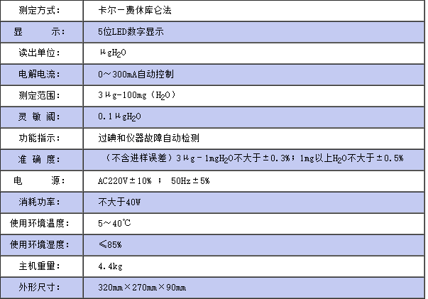 儀器符合GB/T7600;SH/T0246;GB/T606及采用卡爾—費休法測定樣品中水分的有關標準。儀器采用了先進的自動控制電路,電解電流自動跟蹤控制,外型結構新穎,增加了過碘指示和儀器故障自動檢測功能,從而使該儀器工作更可靠,使用更方便, 具有分析速度快(一分鐘出結果)、操作簡便、精度高、自動性強等特點,廣泛應用于石油、化工、電力、鐵路、環保等部門。
