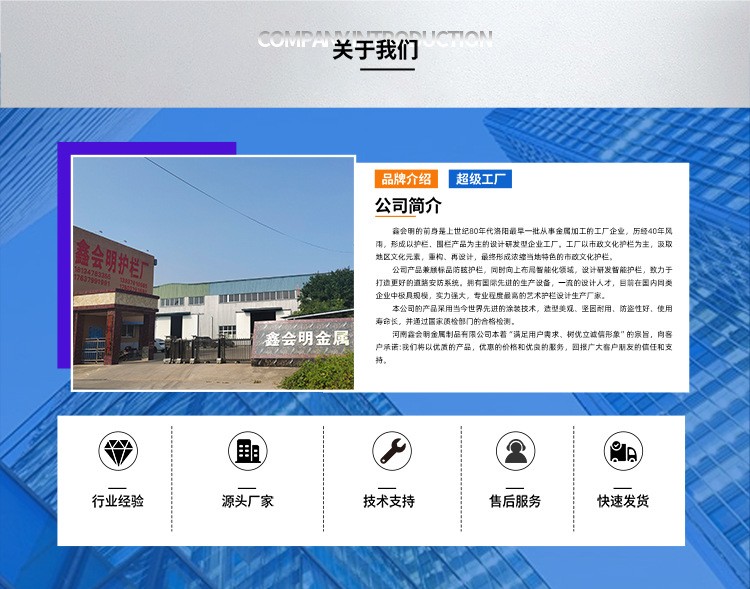 專注從事市政護(hù)欄系列、陽臺(tái)護(hù)欄系列、百葉窗系列、圍墻護(hù)欄系列、橋梁護(hù)欄系列、臨時(shí)圍擋系列、鋅鋼大門系列、涼亭系列等產(chǎn)品